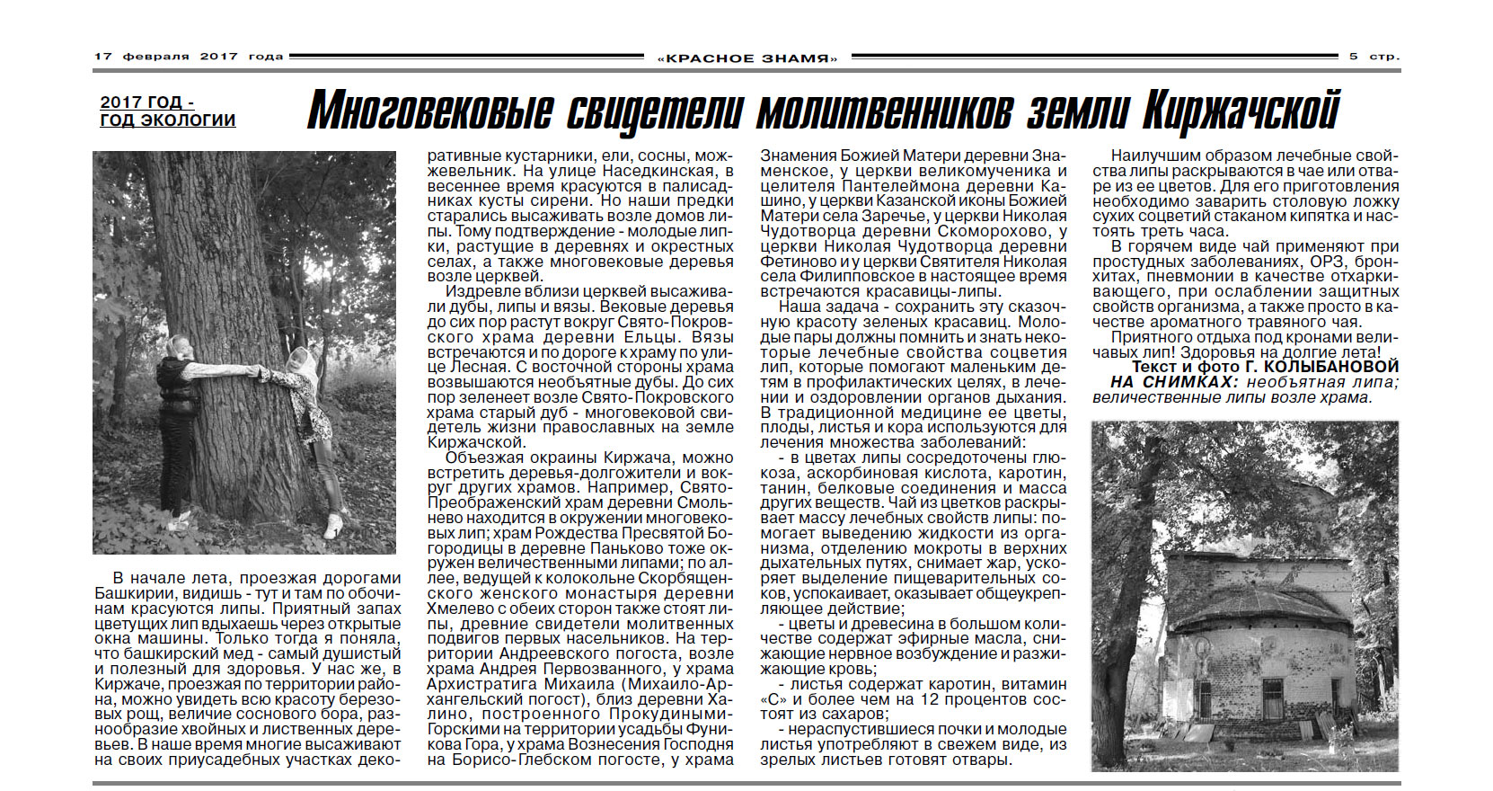 У нас же, в Киржаче, проезжая по территории района, можно увидеть всю красоту березовых рощ, величие соснового бора, разнообразие хвойных и лиственных деревьев. В наше время многие высаживают на своих приусадебных участках декоративные кустарники, ели, сосны, можжевельник. На улице Наседкинская, в весеннее время красуются в палисадниках кусты сирени. Но наши предки старались высаживать возле домов липы. Тому подтверждение — молодые липки, растущие в деревнях и окрестных селах, а также многовековые деревья возле церквей.